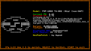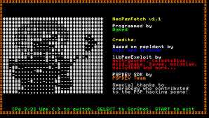 Описание: NeoPspFetch — PSP homebrew, предоставляющая информацию в том же стиле, что и NeoFetch на Linux. Отображает информацию в виде стильной ASCII-графики. Информация о системе: показывает версию прошивки, заводскую версию прошивки, модель материнской платы и многое другое. Информация о батарее: показывает состояние батареи, её ёмкость, температуру и многое другое. Протестировано с официальными аккумуляторами Sony и Ostent. Совместимость с аккумуляторами сторонних производителей может отличаться.